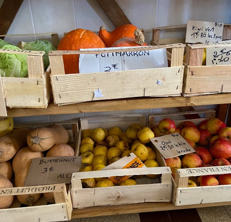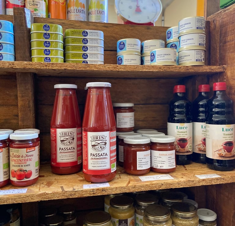 Pain frais local, fruits et légumes, aliments secs, condiments et articles ménagers en stock ou sur commande.